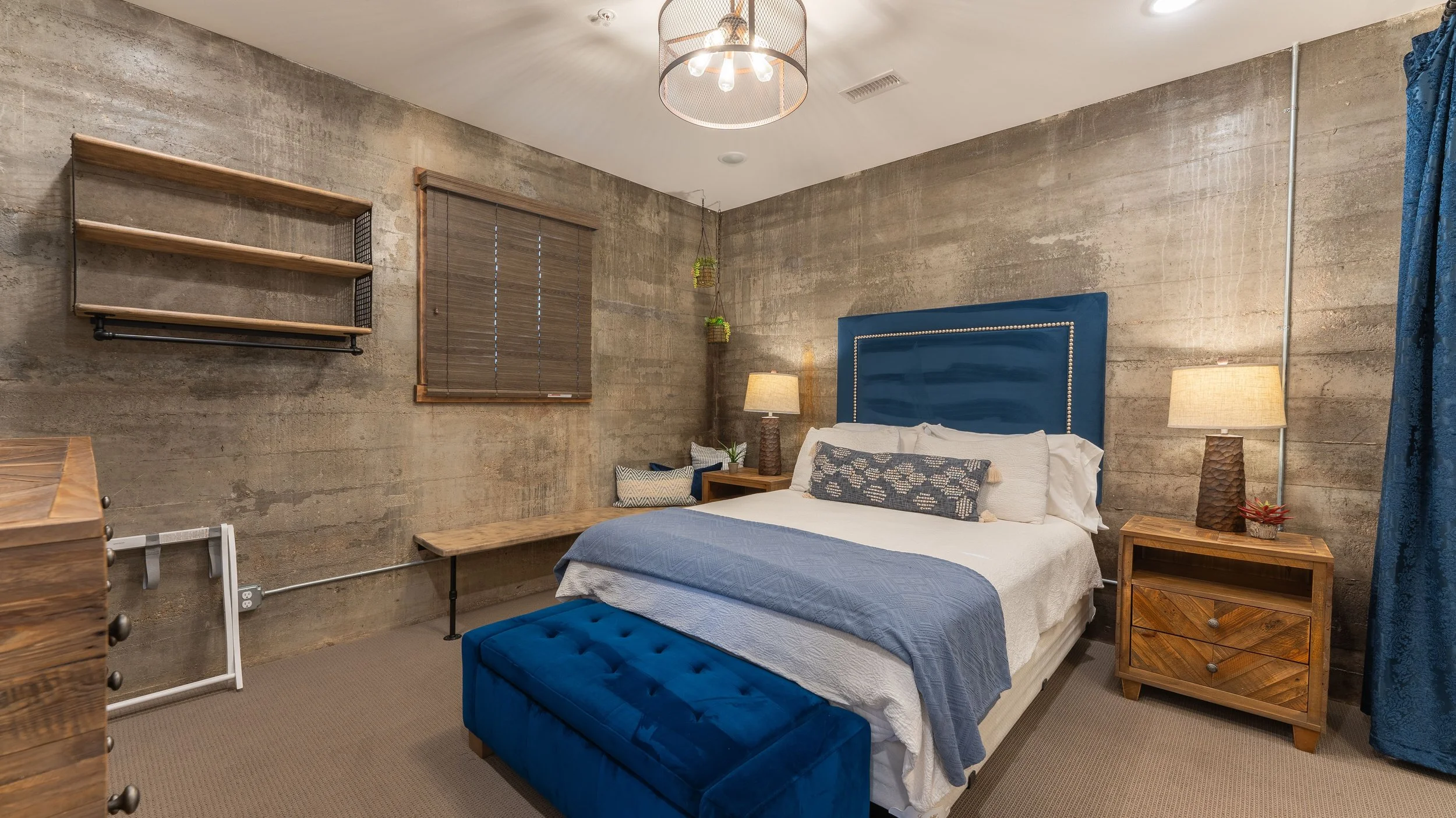 An industrial gem featuring original steel beams and exposed concrete, paired with luxurious furnishings. This unit includes two custom wood platform king beds and a queen bed, each with its own private bathroom. The living room offers a queen sleeper sofa, shuffleboard table, and stunning lake views from the bar seating. Enjoy a fully equipped custom kitchen, a dining table for eight that converts to a poker table, and two cable TVs for your entertainment.