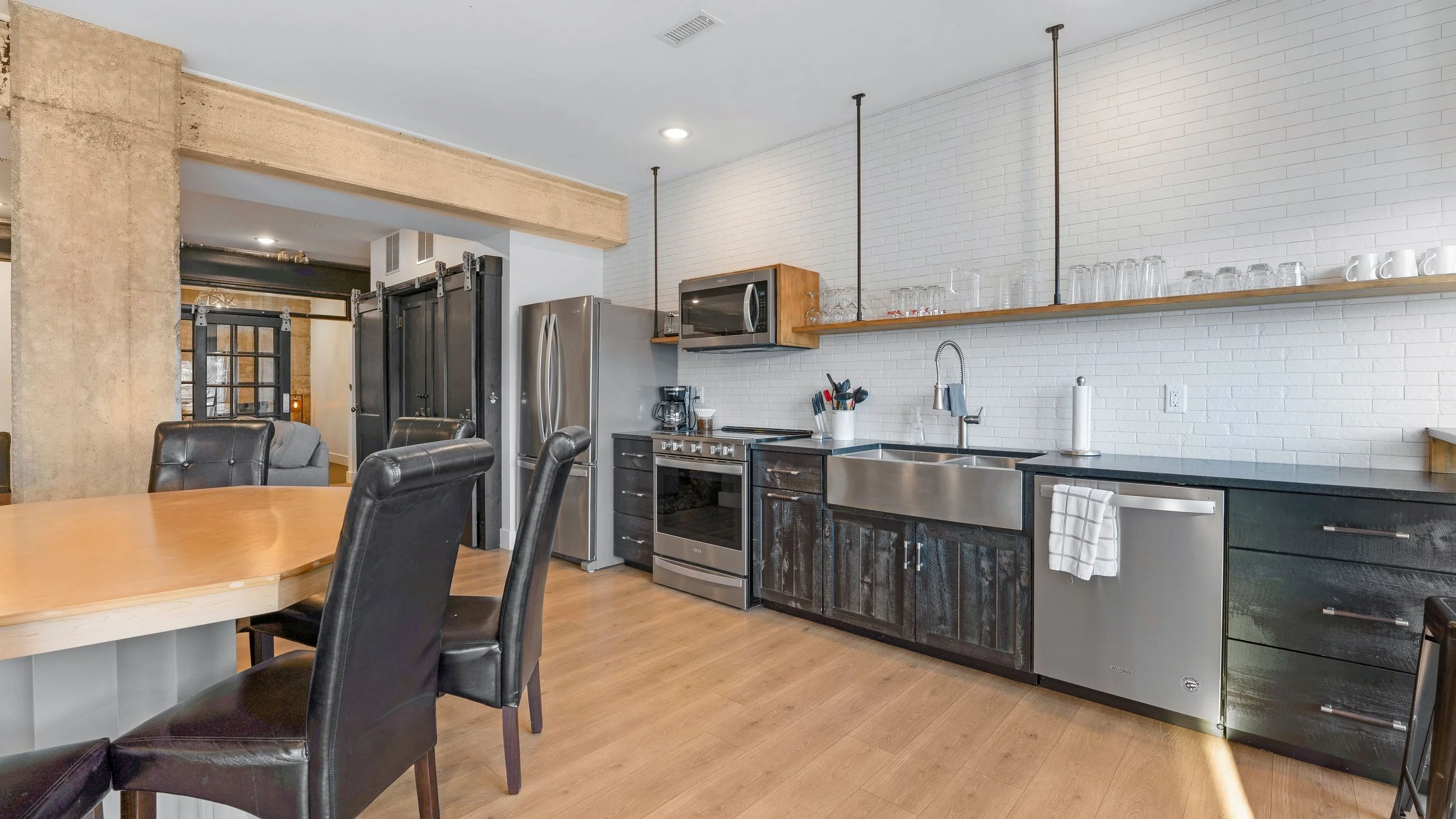 Urban elegance meets lakeside charm with exposed brick, reclaimed wood ceilings, and quartz finishes.